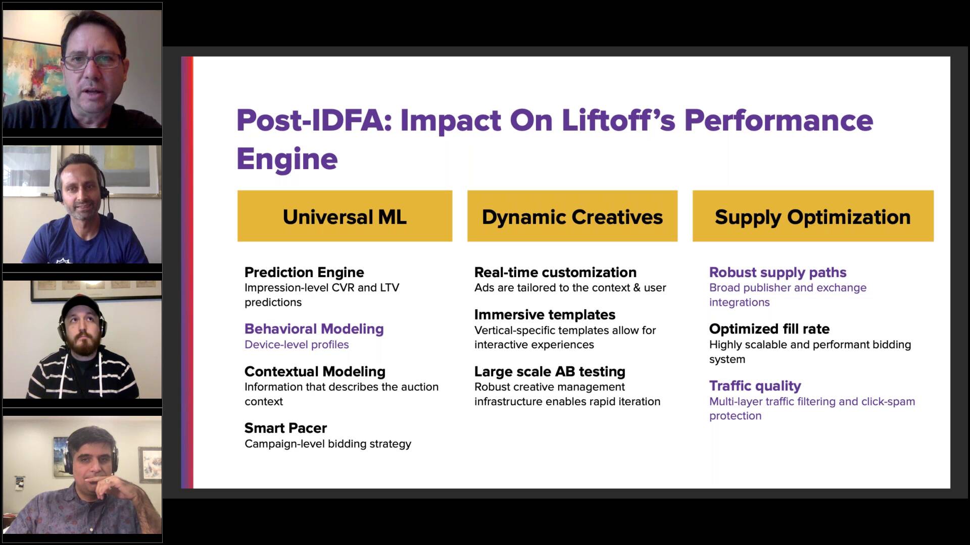 Excited to be one of the experts on this amazing webinar about UA performance on iOS 14. With the pending release of iOS 14 and changes to IDFA, Liftoff has been buying significant amounts of Limited Ad Tracking traffic (with no IDFA available) to understand how this traffic performs vs IDFA traffic in user acquisition.